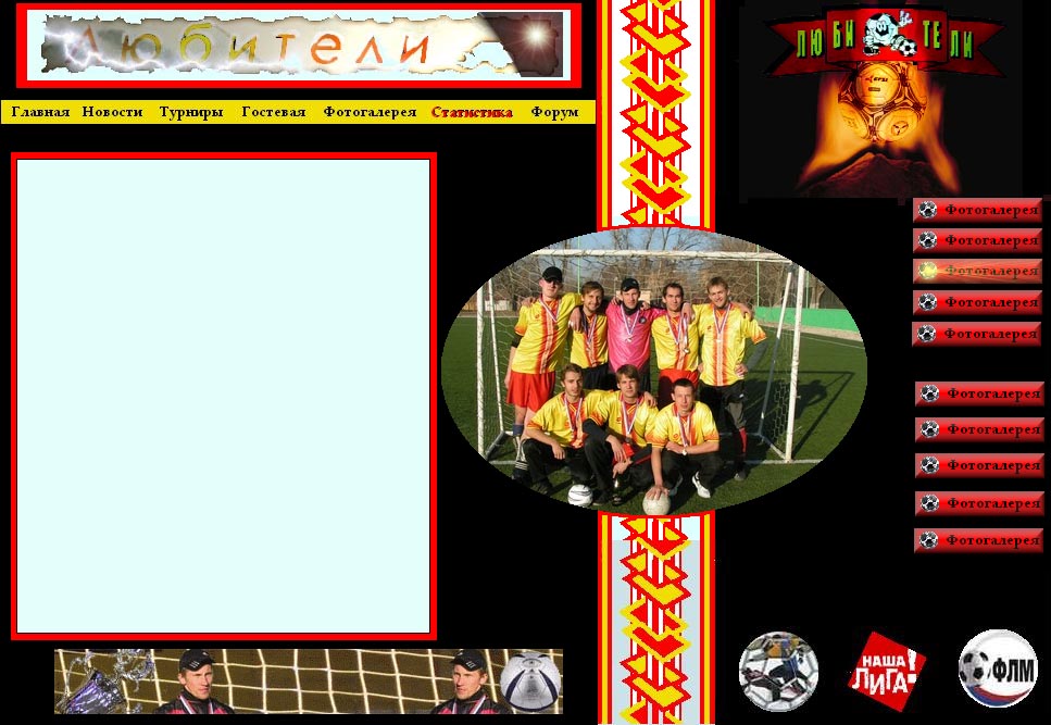 Не смейтесь, но именно так предположительно собиралось выглядеть наше детище изначально. «Великий» редактор Paint, огромный энтузиазм, помноженный на полное отсутствие умения и времени, сделали свое «черное» дело – в течение одного вечера создается прообраз того, что впоследствии будет называться нашим сайтом. Одним из ключевых элементов дизайна становится желто-красная кайма, которая в этот момент присутствует на майках Любителей. Меню справа задумано «просто для красоты» и дублирует верхнее меню, отчего по факту становится бесполезным, но, в конце концов, хочется же хоть какую-то навигацию придумать из серии «я так думаю». Одновременно с этим, подходит к концу первый подготовительный этап работы по «начинке», благодаря внедрению которой, определенные опции сайта доступны не только представителям команды в качестве теста, но и случайно забредшим на сайт посетителям.